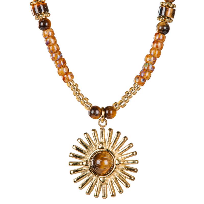 GOLD TONES NECKLACE WITH TIGER EYE BEADS AND PENDANT