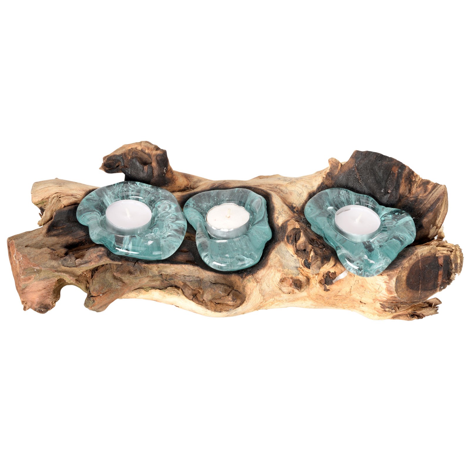 TRIPLE MOLTEN GLASS TEA LIGHT CANDLE HOLDER WITH NATURAL WOOD