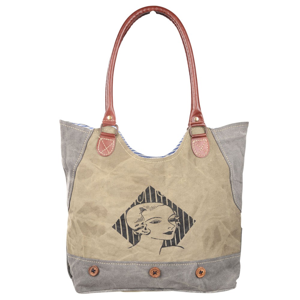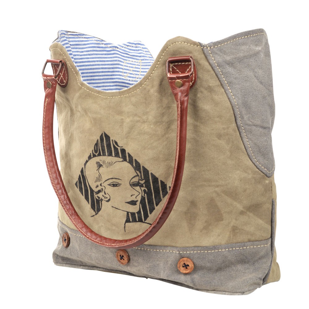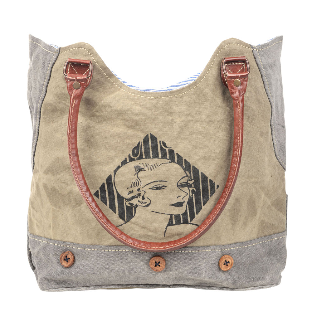 DEER PRINT CANVAS SHOULDER BAG WITH COWHIDE POCKET