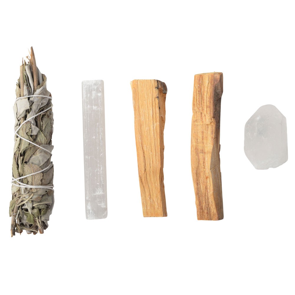 With Sage and Lavender, Selenite Stick, Palo Santo, and Clear Quartz