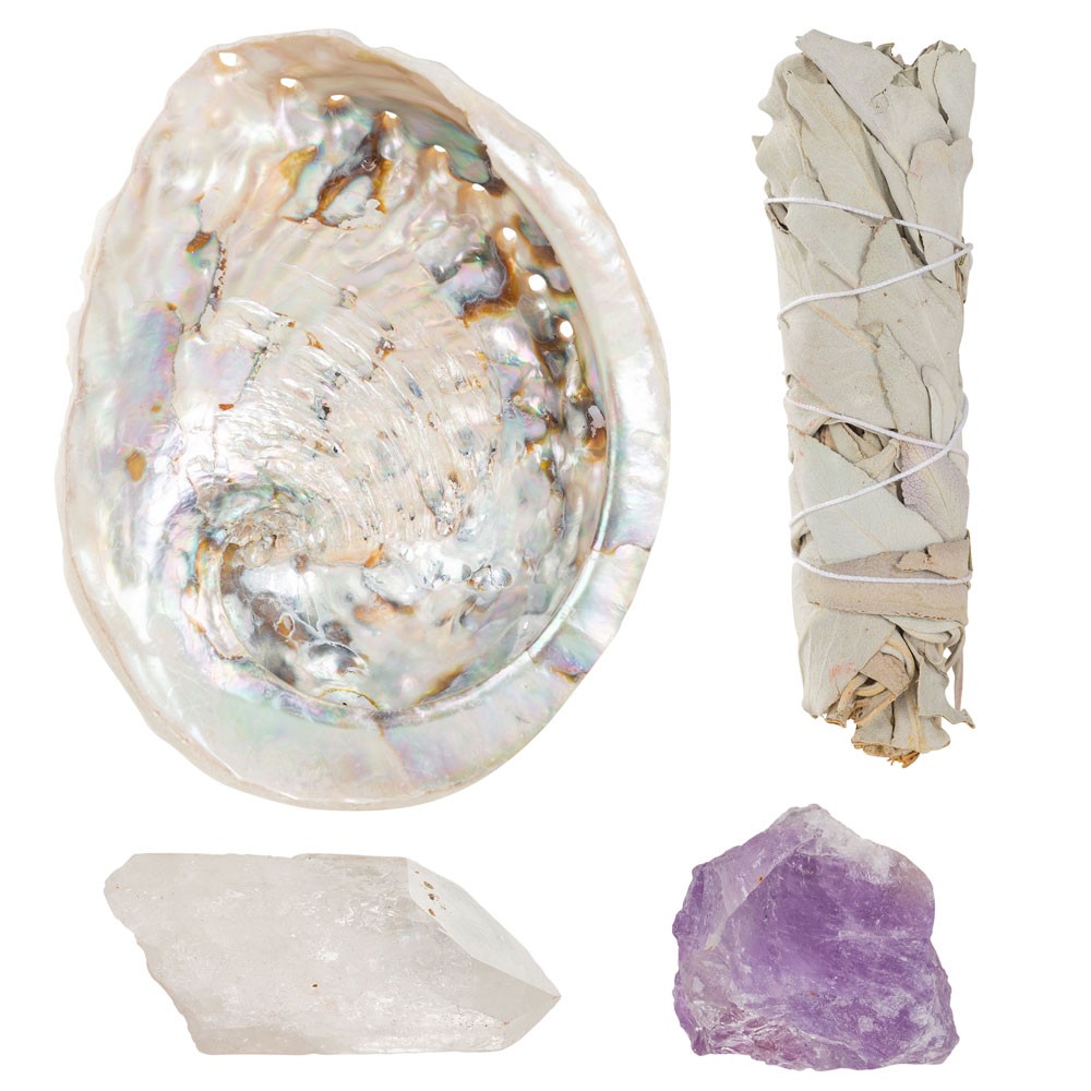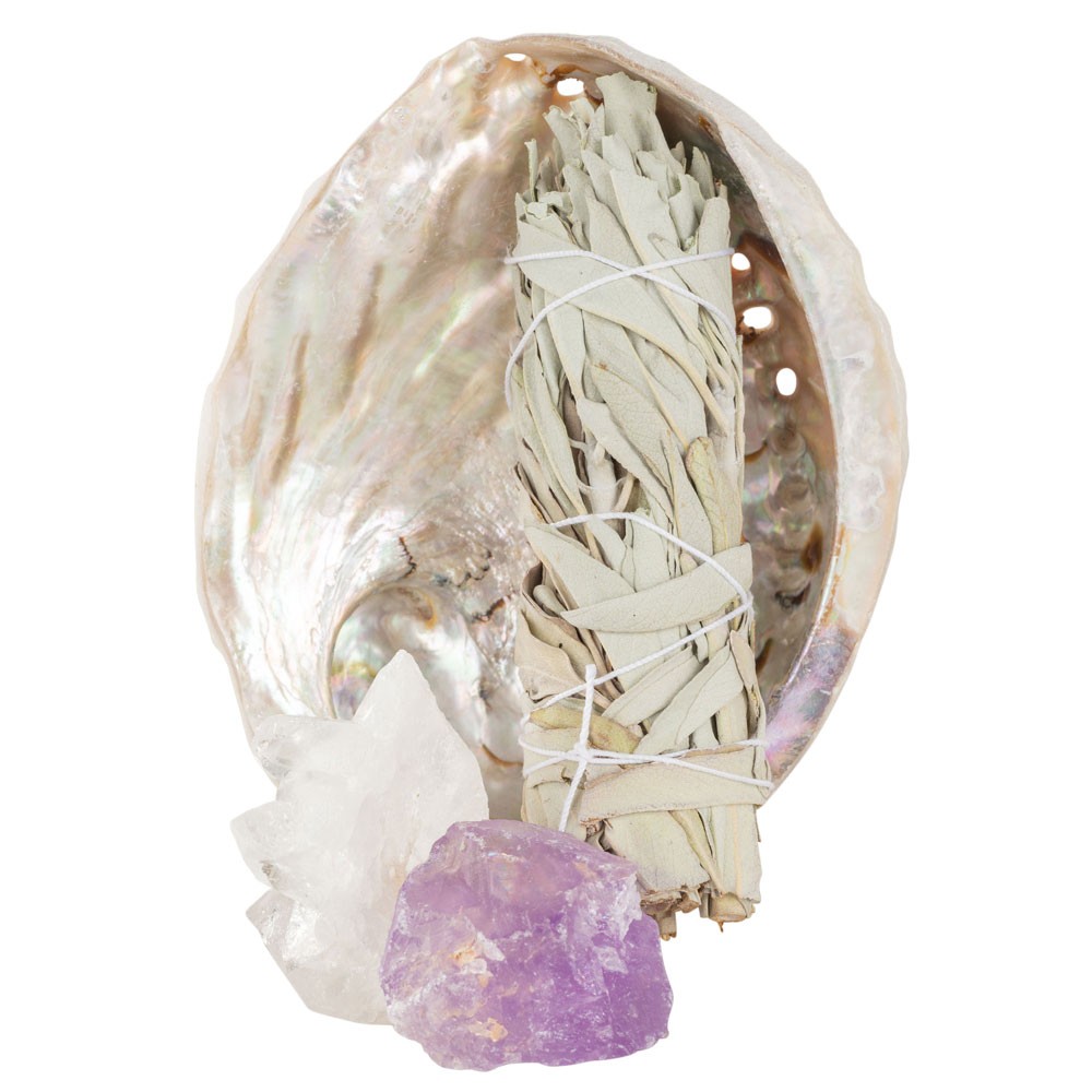 With Sage, Amethyst, Clear Quartz, and Abalone Shell