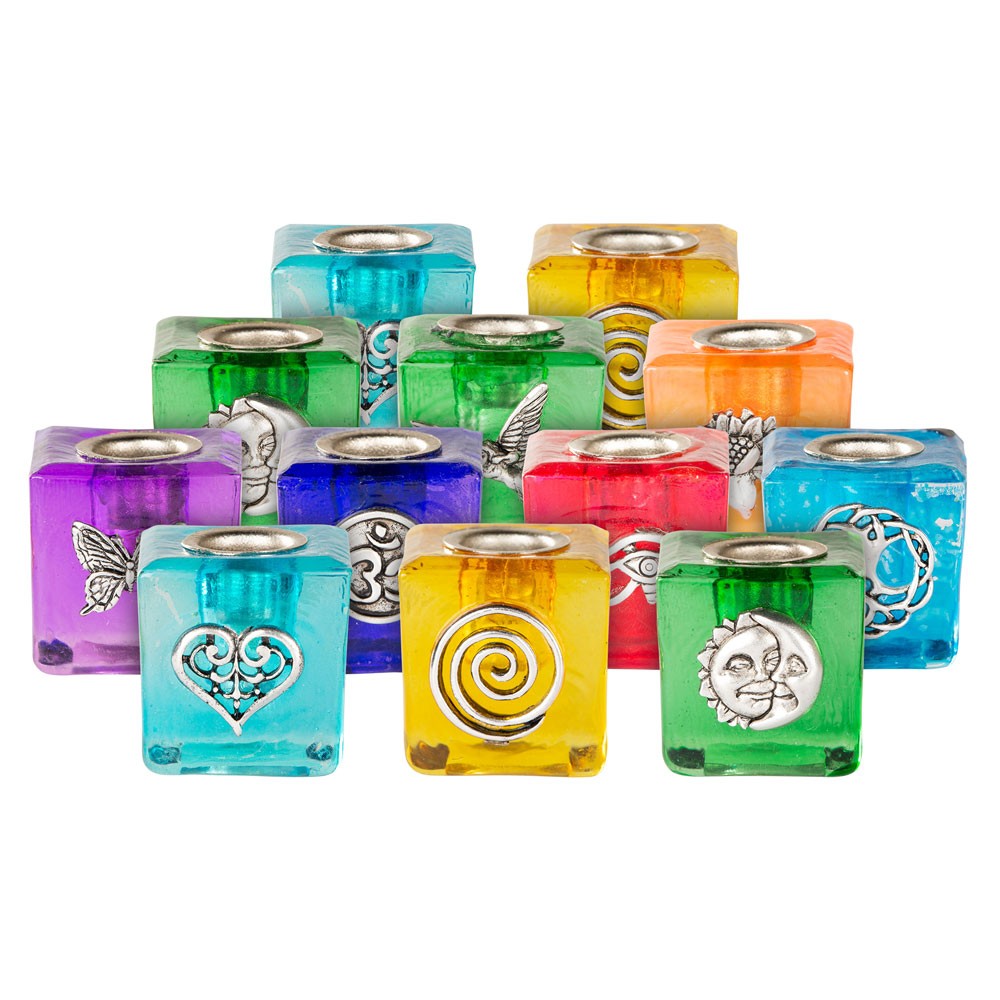 ASSORTED DOZEN GLASS MINI-CANDLE HOLDERS WITH PENDANTS