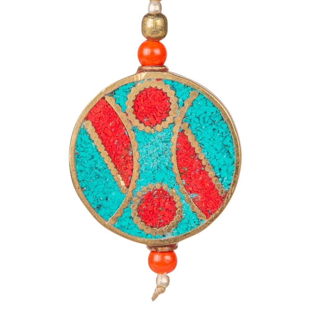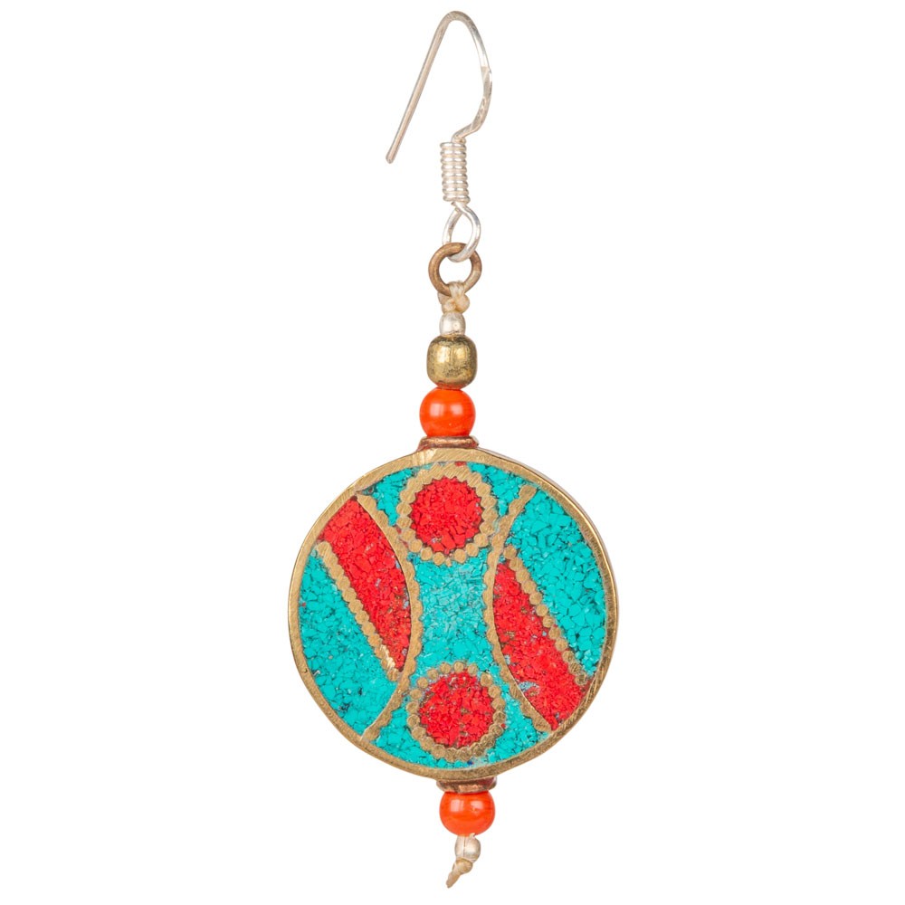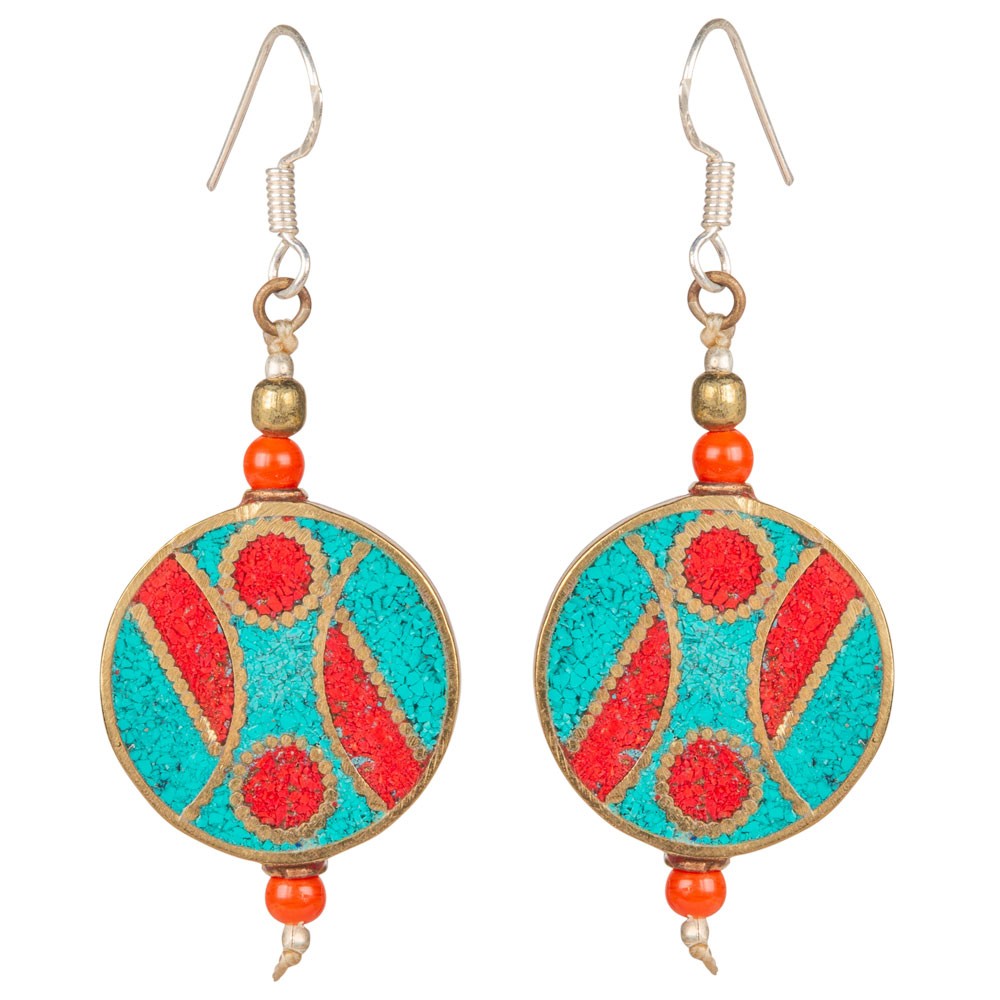 CORAL/TQ ROUND BRASS INLAID NEPALI EARRINGS