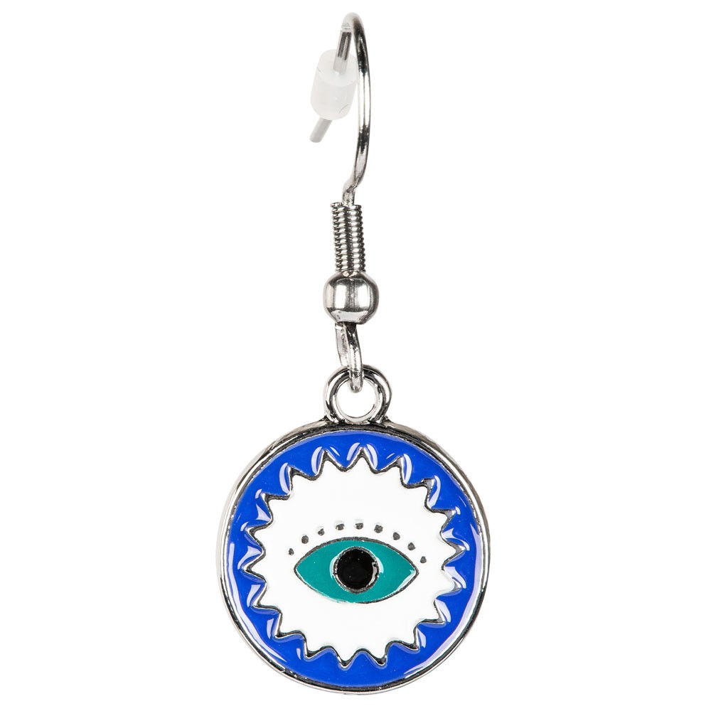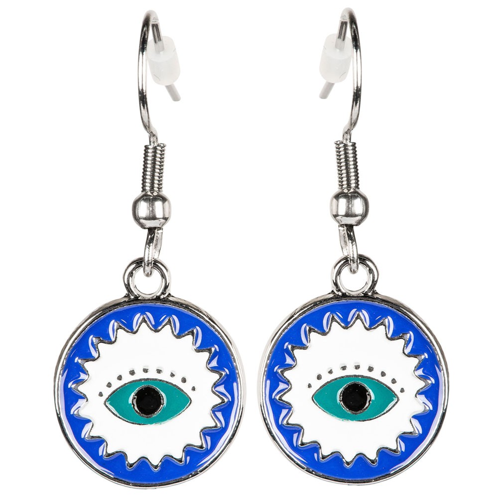 ROUND BLUE EVIL EYE EARRINGS WITH SILVER FINISH