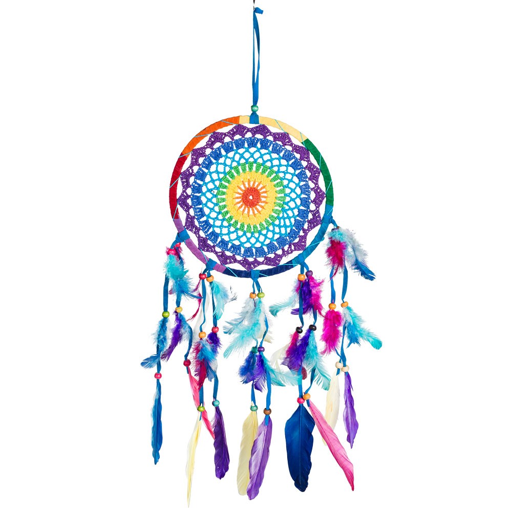 CROCHET RAINBOW DREAMCATCHER WITH FEATHERS AND WOODEN BEADS