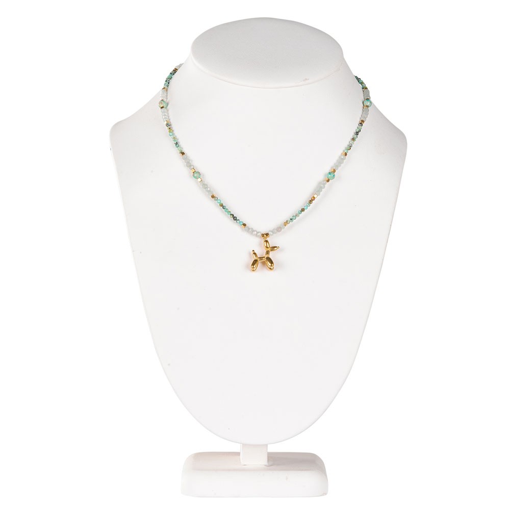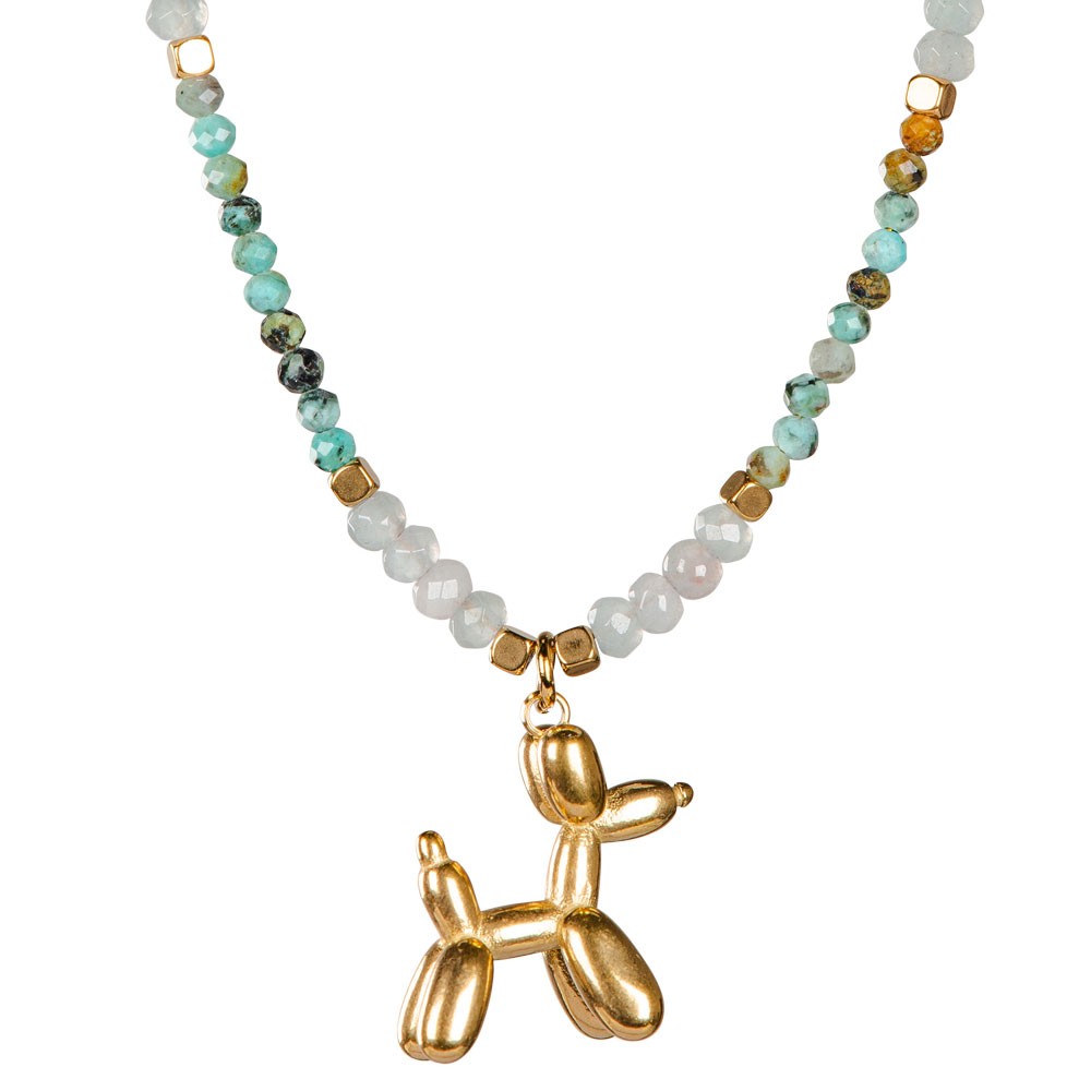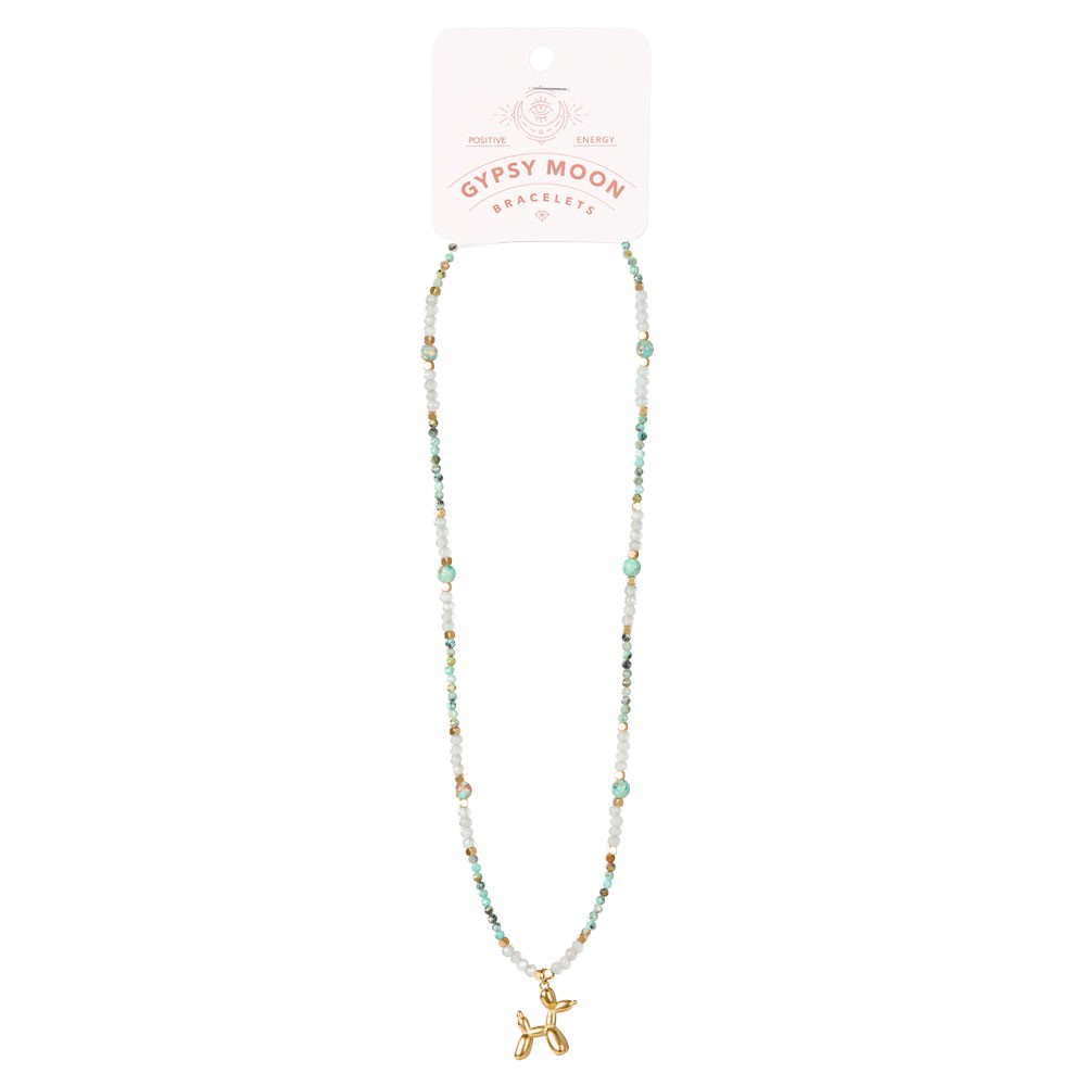 MIXED STONES NECKLACE WITH DOG CHARM AND TURQUOISE, OPALITE, AND GOLD BEADS
