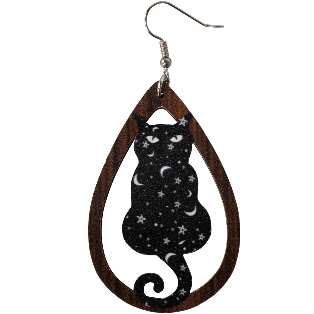 WOOD MOON AND STARS BLACK CAT EARRINGS