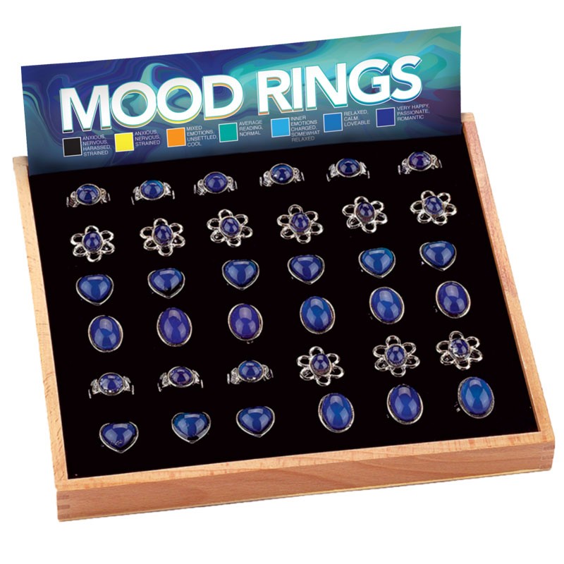 Includes display, 9 silver oval, 9 daisy, 9 heart, 9 crystal ball. Story card included with each ring.